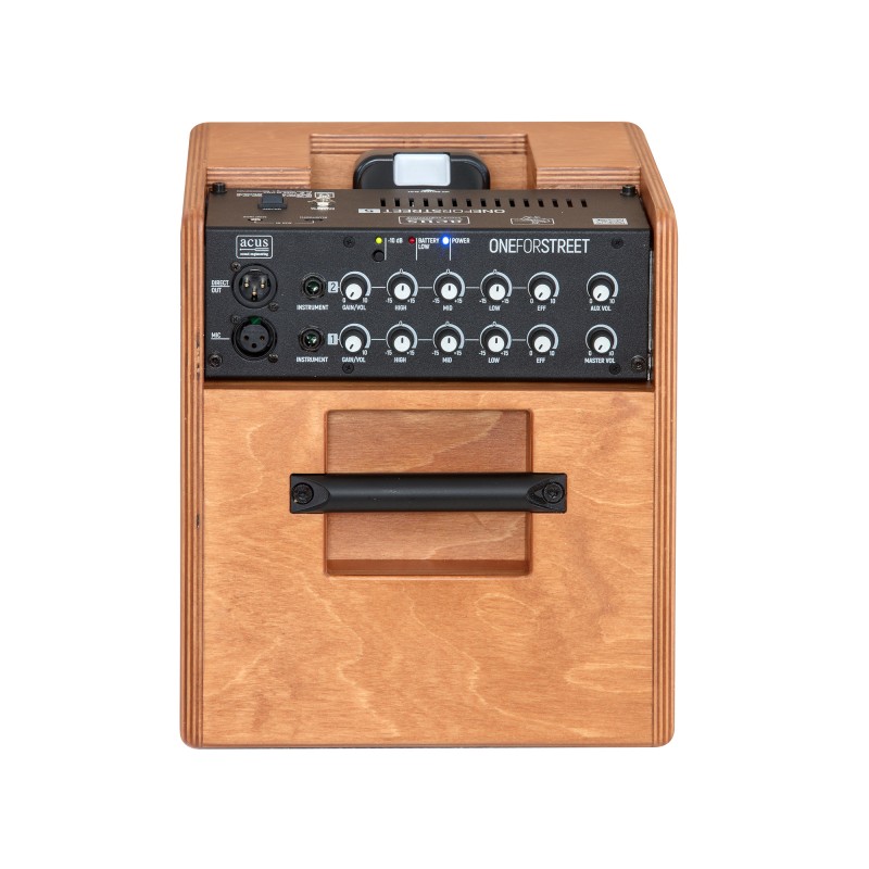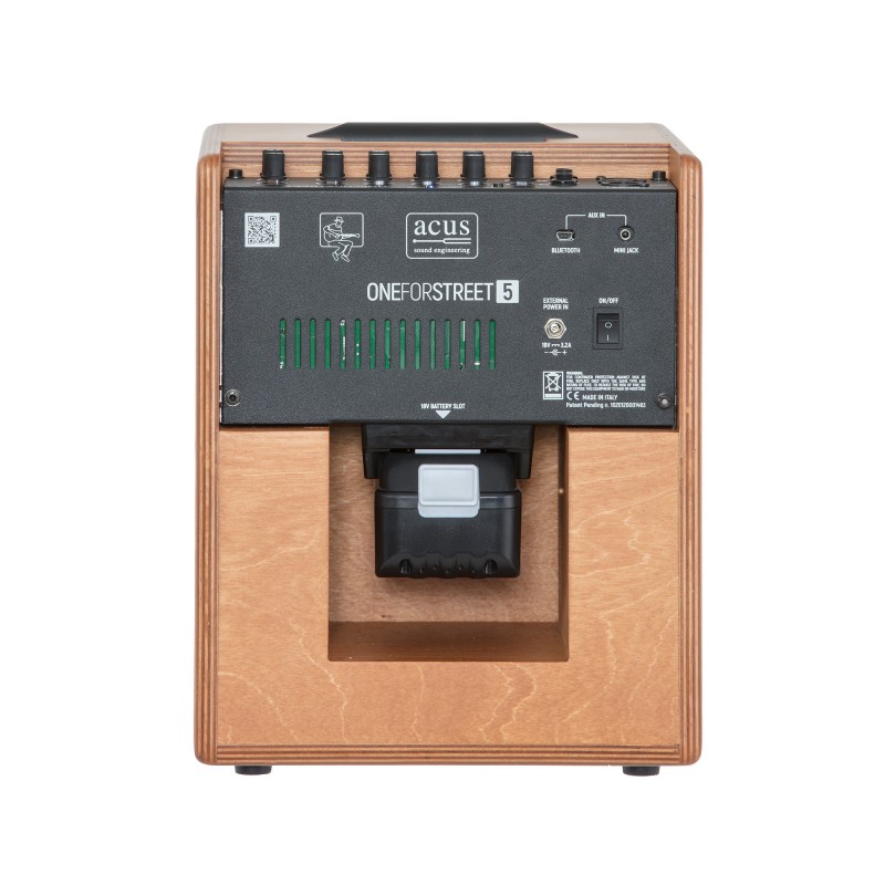 ONEFORSTREET 5 è un amplificatore per chitarra acustica e classica da 40 Watt dotato di 2 ingressi separati (canale 1: ingresso Microfonico o Strumento, canale 2: ingresso Strumento) più un ingresso Aux (che può essere con Jack stereo da 3.5mm oppure col modulo Bluetooth Acus Artesia BT-1) provvisto di volume indipendente. I 2 ingressi sono corredati di Gain/Volume, Equalizzatore a 3 bande e mandata effetto. Il sistema è provvisto di un effetto interno (di tipo Reverbero) e di Volume Master, uscita bilanciata Direct Out (dotata di uno switch di attenuazione, indicato con '-10dB', per adattare il livello della Direct Out ad un ingresso Microfonico) e led di indicatore della carica di batteria (attivo solamente quando il sistema viene alimentato a batteria). L' ingresso microfonico è dotato di phantom power sempre attiva.