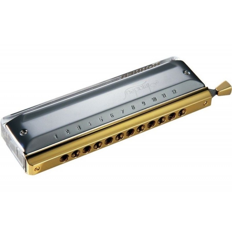 Armonica cromatica in Do, 12 fori, 48 voci, copertura cromata. Materiale piastra di musica: nichel. Rivestimento della bocca: oro. Sistema di cerniera: a zigzag. Pettin di vetro acrilico, transparente, incolore.