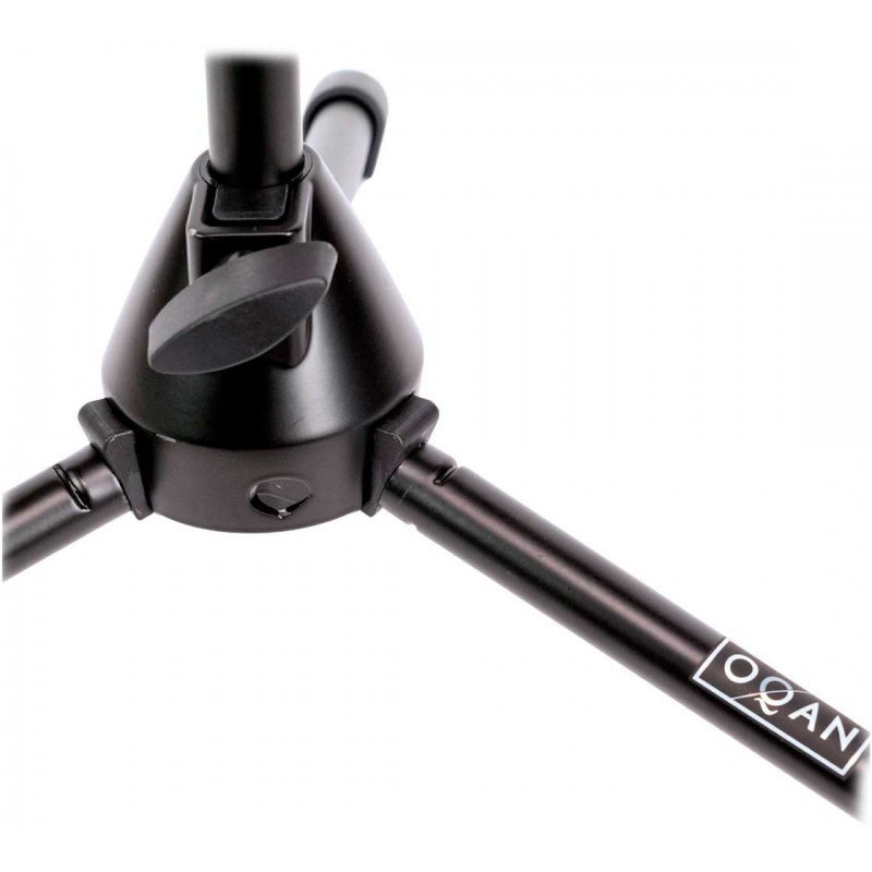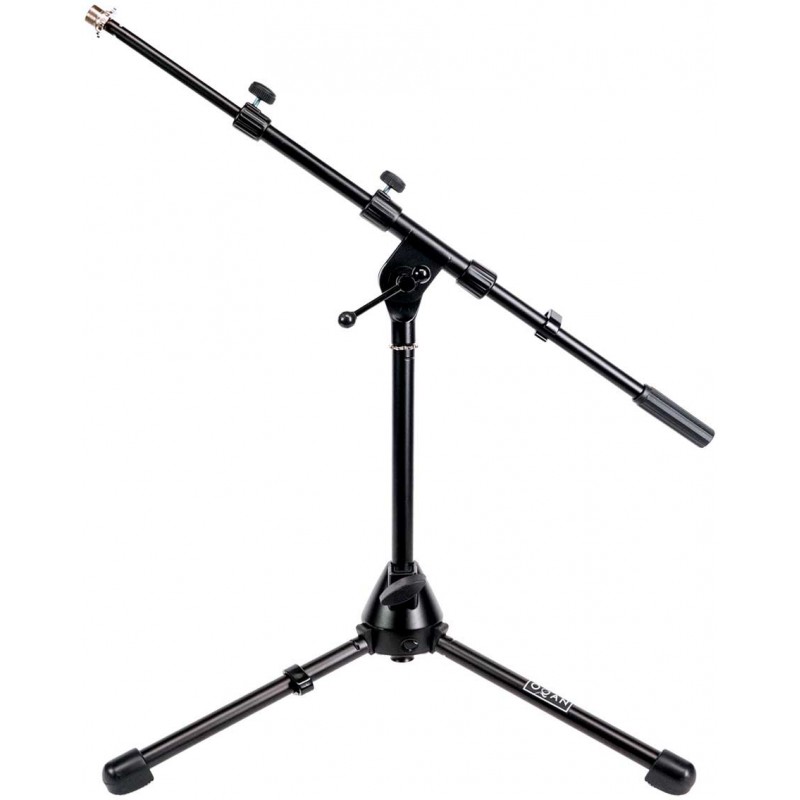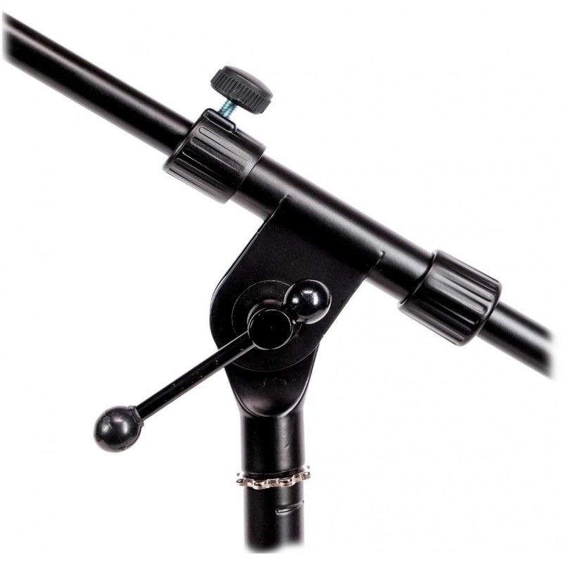 Pie de micrófono corto extensible con jirafa telescópica. Altura máxima 85 cms. Color negro.