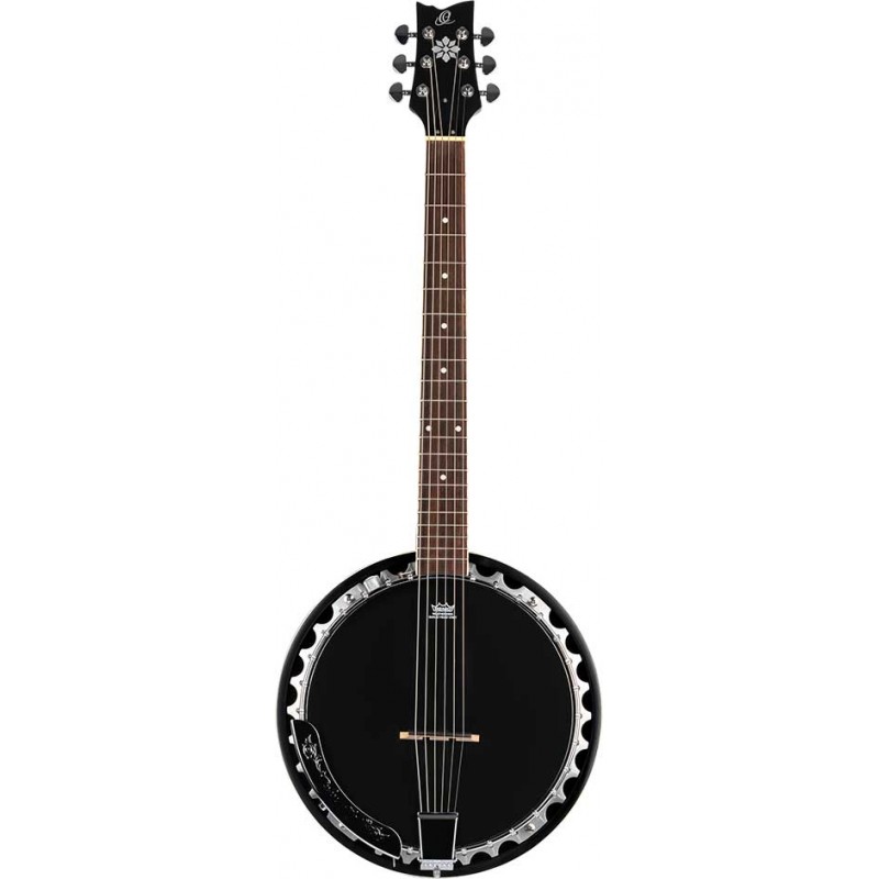 Banjo elettrificato 6 corde. `` Banjitar '' con fasce e accordatura di chitarra e corpo e costruzione banjo. Finitura nero opaco. Include Borse