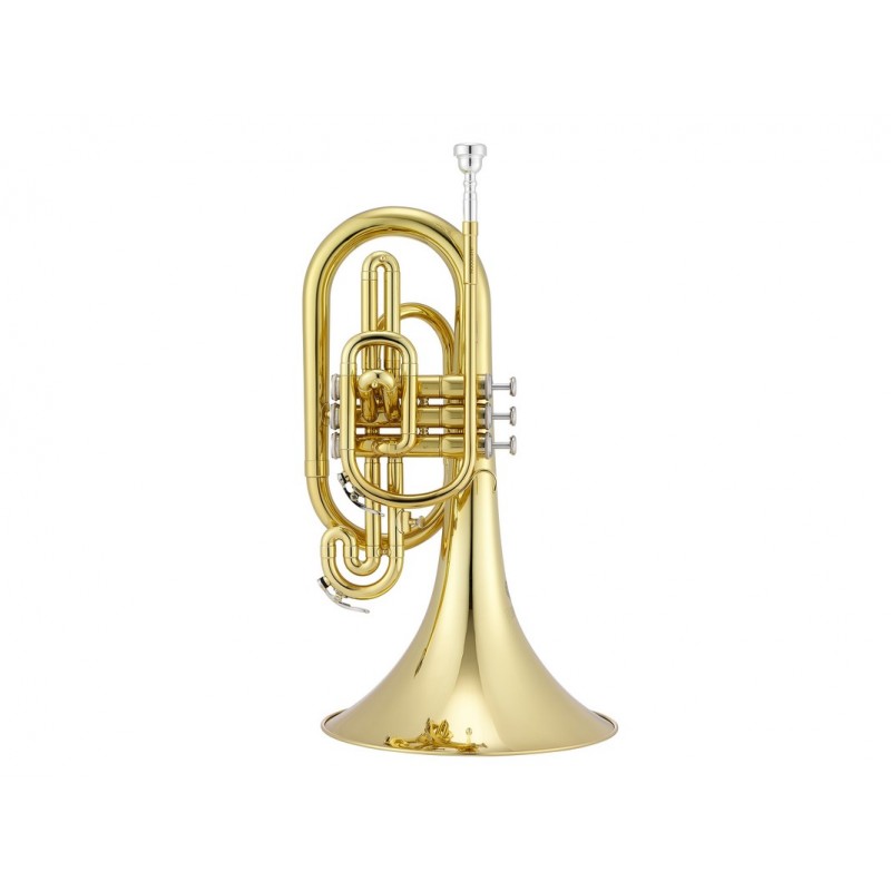 Marching Mellophone in FA / Intonazione: FA / Astuccio e accessori / Serie ottoni da Marching / Canneggio: 11.70 mm / Campana: diametro 255 mm, ottone, laccato / Pistoni: 3, Acciaio inox / Peso: 2.20 kg / Altezza: 475...