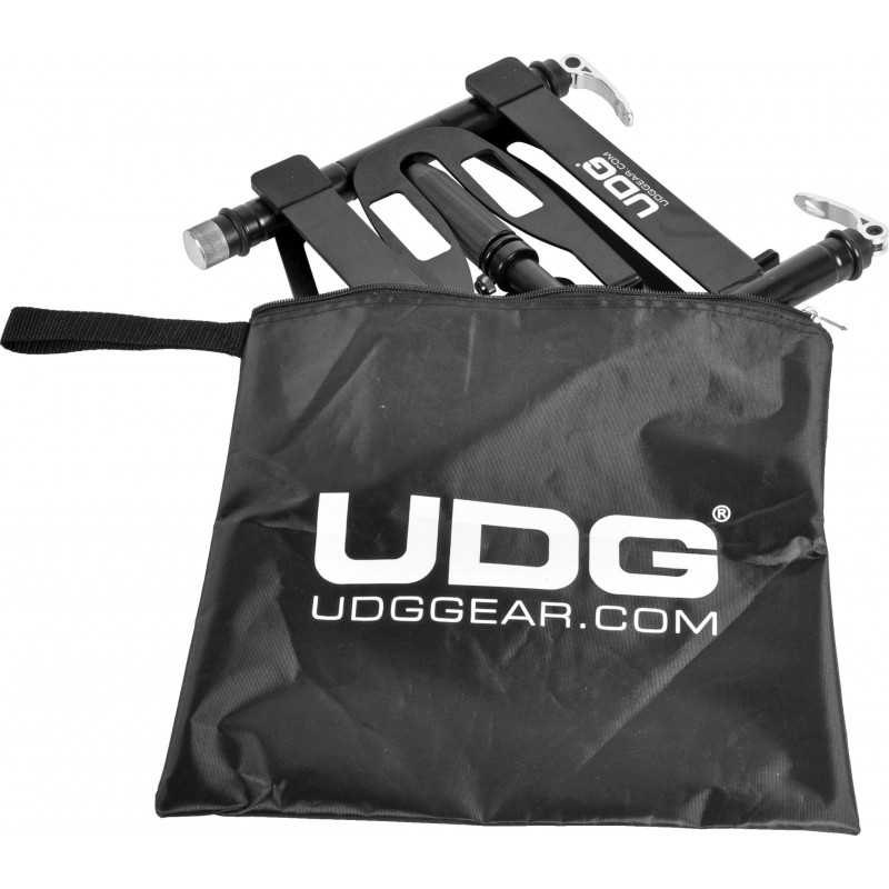 Supporto UDG DIGI Laptop Stand, progettato per DJ e produttori musicali che richiedono massima versatilit e robustezza. La struttura in acciaio verniciato a polvere garantisce stabilit e durata, mentre altezza, inclinazione e vassoio girevole sono completamente regolabili per diverse configurazioni. Include vassoio rimovibile per accessori e custodia protettiva per il trasporto.