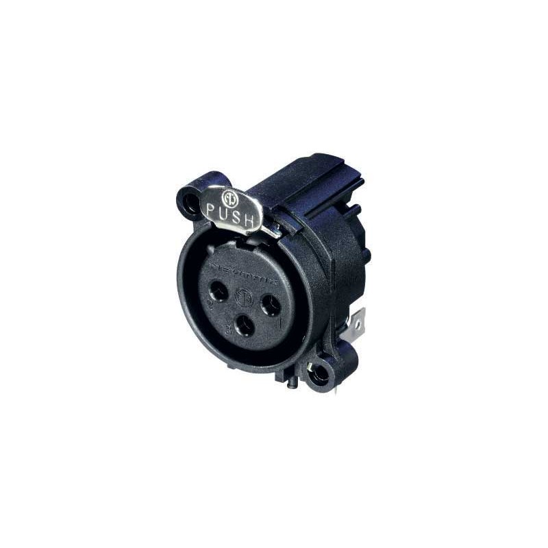 Connettore XLR femmina a 3 pin. Serie AA. Colore: nero, contatti placcati oro. Montaggio verticale su scheda. Corpo rotondo in plastica a basso costo. Nessun collegamento a terra. Design dei contatti a tulipano con...