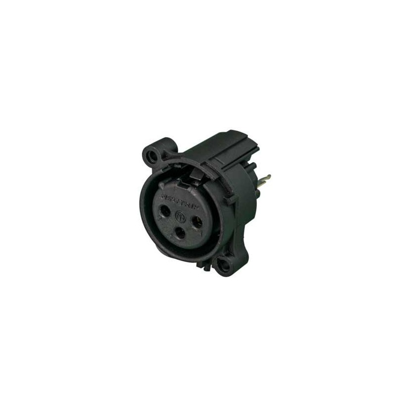 Connettore XLR femmina a 3 pin. Serie AA. Colore: nero, contatti placcati oro. Montaggio verticale su scheda. Corpo rotondo in plastica a basso costo. Nessun collegamento a terra. Design dei contatti a tulipano con...