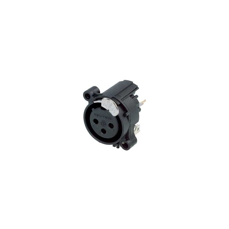 Connettore XLR femmina a 3 pin. Serie AA. Colore: nero, contatti placcati oro. Montaggio verticale su scheda. Corpo rotondo in plastica a basso costo. Messa a terra: Pin 1 collegato direttamente al pannello frontale e...