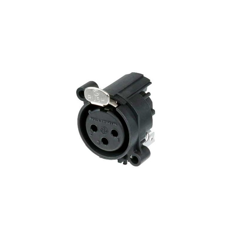 Connettore XLR femmina a 3 pin. Serie A. Colore: nero, contatti placcati oro. Montaggio orizzontale su scheda. Corpo rotondo in plastica a basso costo. Messa a terra: Pin 1 collegato direttamente al pannello frontale e all'alloggiamento del connettore, nessun contatto di terra separato. Prese XLR più piccole, maggiore densità di confezionamento (centri da 23 mm). Design dei contatti a tulipano con elevata pressione di contatto per la massima durata. Ritaglio del pannello frontale e design del PCB compatibili al 100% con la Serie A. Chiusura di sicurezza montata. Materiali: alloggiamento in poliammide. Specifiche ambientali: infiammabilità UL 94 V-0, standard IEC 61076-2-103, protezione IP 40, intervallo di temperatura da -30 °C a +80 °C.