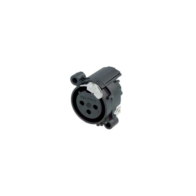 Connettore XLR femmina a 3 pin. Serie A. Colore: nero, contatti placcati oro. Montaggio orizzontale su scheda. Corpo rotondo in plastica a basso costo. Messa a terra: contatto di terra separato collegato all'alloggiamento del connettore e al pannello frontale, nessun collegamento al pin 1. Prese XLR più piccole, maggiore densità di imballaggio (23 mm da centro a centro). Design dei contatti a tulipano con elevata pressione di contatto per la massima durata. Ritaglio del pannello frontale e design del PCB compatibili al 100% con la serie A. Sistema di chiusura a pressione asimmetrica per un risparmio di spazio di circa il 20%. Materiali: alloggiamento in poliammide. Specifiche ambientali: infiammabilità UL94 V-0, standard IEC 61076-2-103, protezione IP 40, intervallo di temperatura da -30 °C a +80 °C.
