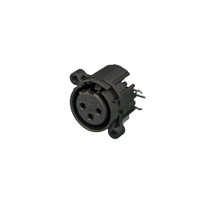 Connettore XLR femmina a 3 pin. Serie A. Colore: nero, contatti placcati oro. Montaggio su PCB a destra. Corpo rotondo in plastica più economico. Messa a terra: Pin 1 collegato direttamente al pannello frontale e all'alloggiamento del connettore, nessun contatto di terra separato. Prese XLR più piccole, maggiore densità di confezionamento (centri da 23 mm). Design dei contatti a tulipano con elevata pressione di contatto per la massima durata. Ritaglio del pannello frontale e design del PCB compatibili al 100% con la Serie A. Integra una molla di ritenzione al posto della chiusura. Materiali: alloggiamento in poliammide. Specifiche ambientali: infiammabilità UL 94 V-0, standard IEC 61076-2-103, protezione IP 40, intervallo di temperatura da -30 °C a +80 °C.