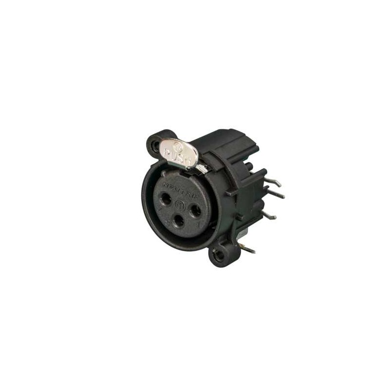 Connettore XLR femmina a 3 pin. Serie A. Colore: nero, contatti placcati oro. Montaggio su PCB a destra. Corpo rotondo in plastica più economico. Messa a terra: contatto di terra separato collegato all'alloggiamento del connettore e al pannello frontale, nessun collegamento al pin 1. Prese XLR più piccole, maggiore densità di imballaggio (23 mm da centro a centro). Design dei contatti a tulipano con elevata pressione di contatto per la massima durata. Ritaglio del pannello frontale e design del PCB compatibili al 100% con la serie A. Chiusura di sicurezza in acciaio montata. Materiali: alloggiamento in poliammide. Specifiche ambientali: infiammabilità UL 94 V-0, standard IEC 61076-2-103, protezione IP 40, intervallo di temperatura da -30 °C a +80 °C.