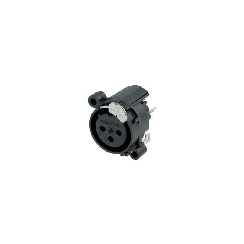 Connettore XLR femmina a 3 pin. Serie A. Colore: nero, contatti placcati oro. Montaggio verticale su scheda. Corpo rotondo in plastica a basso costo. Messa a terra: Pin 1 collegato direttamente al pannello frontale e all'alloggiamento del connettore, nessun contatto di terra separato. Prese XLR più piccole, maggiore densità di confezionamento (centri da 23 mm). Design dei contatti a tulipano con elevata pressione di contatto per la massima durata. Ritaglio del pannello frontale e design del PCB compatibili al 100% con la Serie A. Sistema di chiusura a pressione asimmetrica per un risparmio di spazio di circa il 20%. Materiali: alloggiamento in poliammide. Specifiche ambientali: infiammabilità UL94 V-0, standard IEC 61076-2-103, protezione IP 40, intervallo di temperatura da -30 °C a +80 °C.
