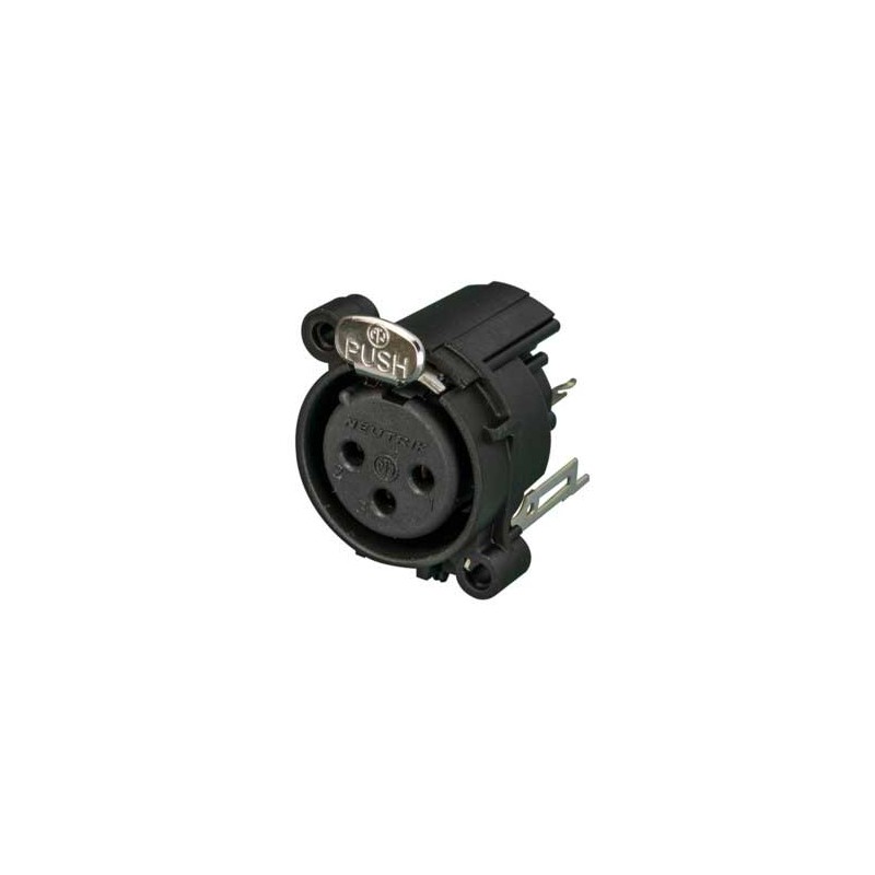 Connettore XLR femmina a 3 pin. Serie A. Colore: nero, contatti placcati oro. Montaggio verticale su scheda. Corpo rotondo in plastica a basso costo. Messa a terra: contatto di terra separato collegato all'alloggiamento del connettore e al pannello frontale, nessun collegamento al pin 1. Prese XLR più piccole, maggiore densità di imballaggio (23 mm da centro a centro). Design dei contatti a tulipano con elevata pressione di contatto per la massima durata. Ritaglio del pannello frontale e design della scheda compatibile al 100% con la serie A. Chiusura di sicurezza montata. Materiali: alloggiamento in poliammide. Specifiche ambientali: infiammabilità UL 94 V-0, standard IEC 61076-2-103, protezione IP 40, intervallo di temperatura da -30 °C a +80 °C.
