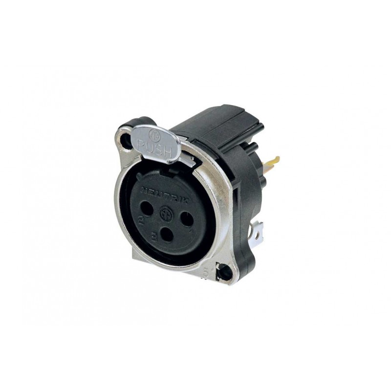 Connettore XLR femmina a 3 pin. Serie B. Colore: nichel, contatti placcati oro. Montaggio verticale su scheda. Messa a terra: Pin 1 collegato direttamente al pannello frontale e all'alloggiamento del connettore, nessun contatto di terra separato. Prese XLR più piccole, maggiore densità di imballaggio. Design dei contatti a tulipano con elevata pressione di contatto per la massima durata. La flangia di montaggio in metallo fornisce un contatto di massa circonferenziale continuo con lo chassis per una migliore protezione EMC e RF. Chiusura di sicurezza in acciaio Ck67. Materiali: inserto in poliammide, alloggiamento in zinco. Specifiche ambientali: infiammabilità UL 94 V-0, standard IEC 61076-2-103, protezione IP 40, intervallo di temperatura da -30°C a +80°C.