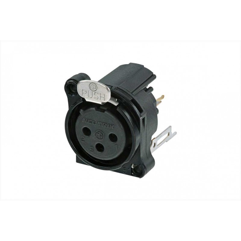 Connettore XLR femmina a 3 pin. Serie B. Colore: nero cromato, contatti placcati oro. Montaggio verticale su scheda. Messa a terra: contatto di terra separato collegato all'alloggiamento del connettore e al pannello frontale, nessun collegamento al pin 1. Prese XLR più piccole, maggiore densità di imballaggio. Design dei contatti a tulipano con elevata pressione di contatto per la massima durata. La flangia di montaggio in metallo fornisce un contatto di terra circonferenziale continuo con lo chassis per una migliore protezione EMC e RF. Chiusura di sicurezza in acciaio Ck67. Materiali: inserto in poliammide, alloggiamento in zinco. Specifiche ambientali: infiammabilità UL 94 V-0, standard IEC 61076-2-103, protezione IP 40, intervallo di temperatura da -30°C a +80°C.