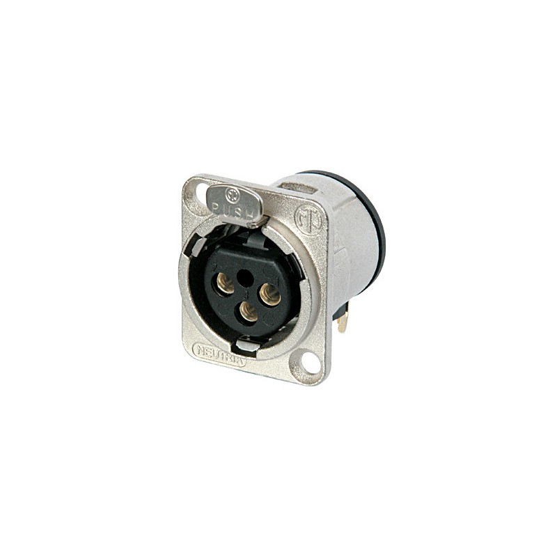 Connettore XLR femmina a 3 pin. Serie D. Colore: nichel, contatti argento. Montaggio orizzontale su PCB. Presa XLR universale per montaggio a pannello con corpo metallico di dimensioni D per applicazioni di montaggio...