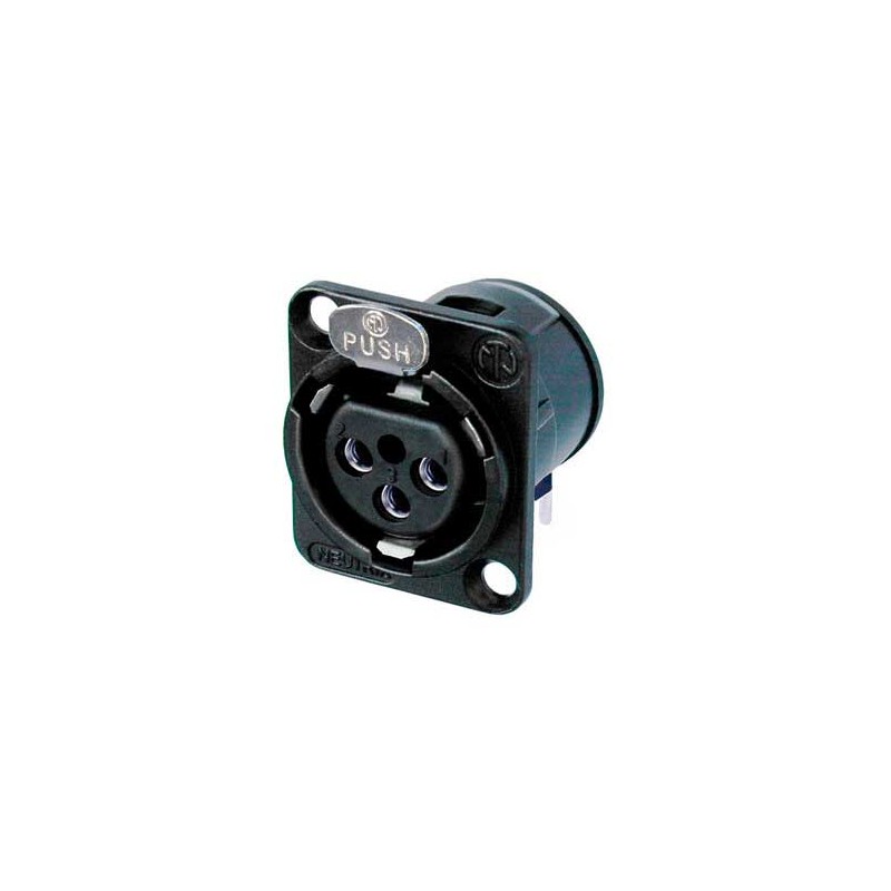 Connettore XLR femmina a 3 pin. Serie D. Colore: nero, contatti argento. Montaggio orizzontale su scheda. Presa XLR universale per montaggio a pannello con corpo metallico di dimensioni D per applicazioni di montaggio...