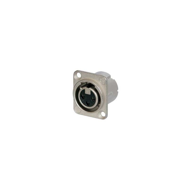 Connettore XLR femmina a 3 pin. Serie DLX. Colore: nichel, contatti argento. Serie XLR per montaggio a pannello, con corpo metallico di dimensione D. Contatto di terra duplex per un'eccellente integrità del contatto...