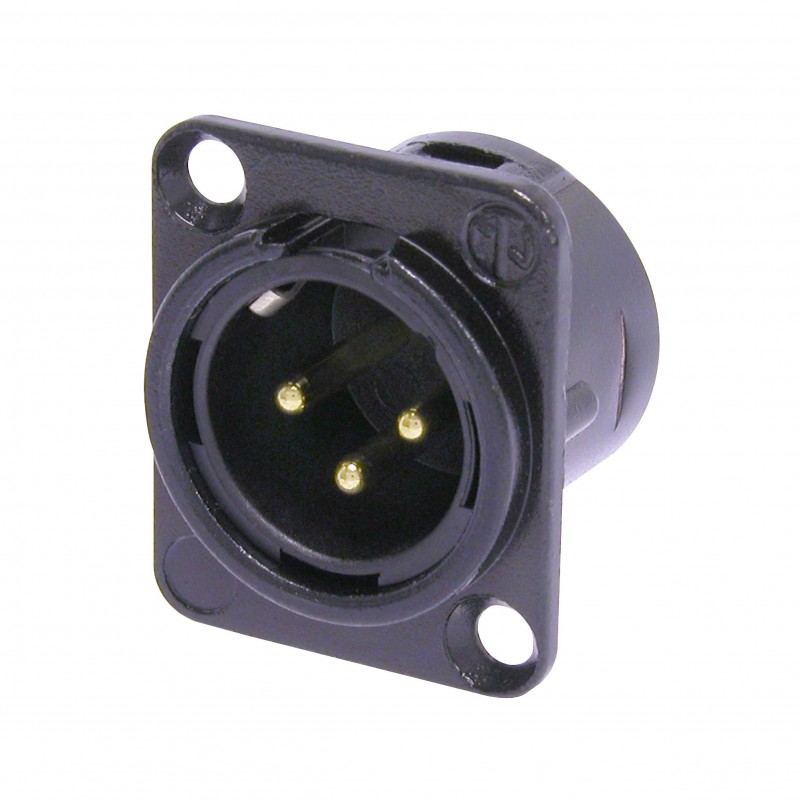 Presa maschio a 3 poli, con terminali a saldare, alloggiamento in metallo nero, contatti placcati in oro.Serie XLR universale da pannello con corpo in metallo di dimensioni D. Componente riconosciuto UL.