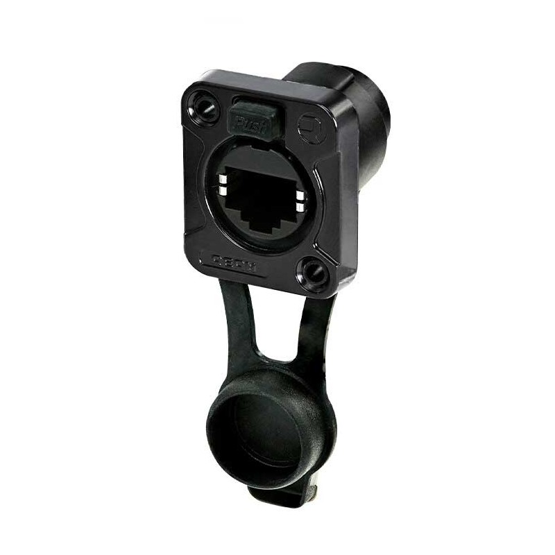 Connettore RJ45 femmina per chassis con flangia di montaggio frontale taglia D, grado di protezione IP65 (alloggiamento placcato nero, passo RJ45) 100 pz.