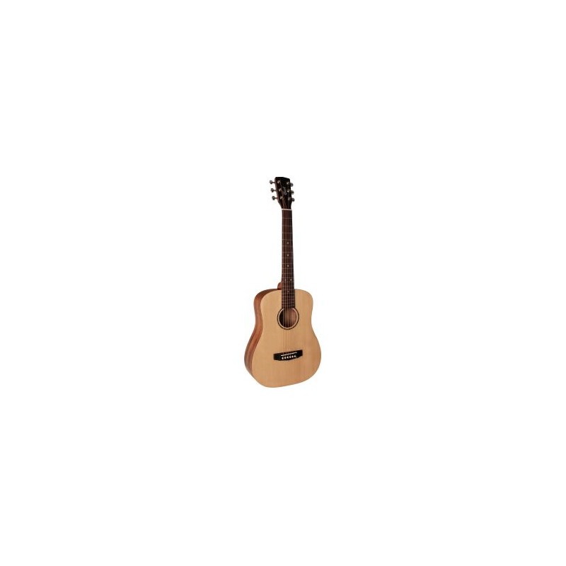Chitarra acustica tipo dreadnought mini. Dimensioni 3/4. Tavola in abete. Fasce, fondo e manico in mogano. Tastiera e ponte in palissandro. 19 tasti. Scala 22,8. Finitura Open Pore. Custodia inclusa.