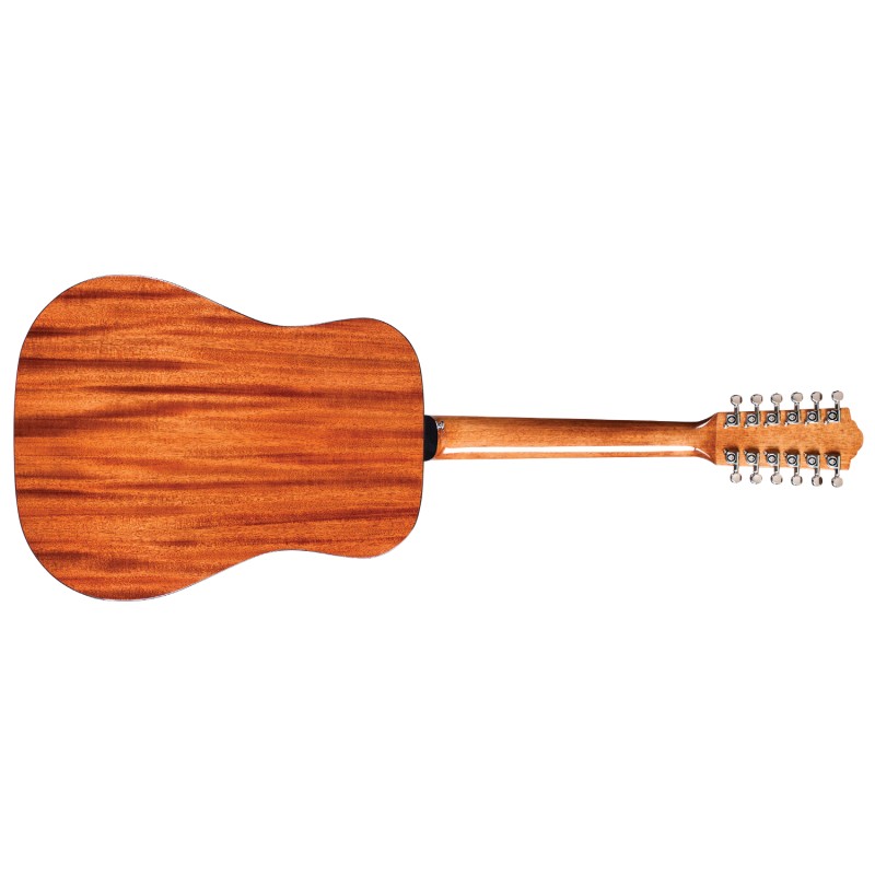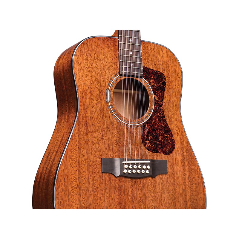 'Le 12-corde guild sono diventate popolari poco dopo la loro introduzione nel 1964, apprezzate per il loro suono e per la grande suonabilità contraddistinte dal classico suono jangly associato alle 12 corde Guild. Guild offre ai musicisti il timbro iconico prodotto dalle chitarre ''All Mahogany''.La chitarra è costruita con top, fondo e fasce in mogano Africano massello, La D-1212 è una dreadnought 12-corde, il manico è in mogano Profilo C, la tastiera e il ponte sono in palissandro, il nut (48 mm) e il traversino sono in osso ,la rosetta in madreperla, il battipenna Vintage style in celluloide tartarugata. L'iconica paletta Guild Chesterfield reminescenza dei '60 completano il pacchetto. La D-1212E include il case Guild in polyfoam leggero ed è disponibile in finitura poliuretanica Natural gloss ( Lucida) '