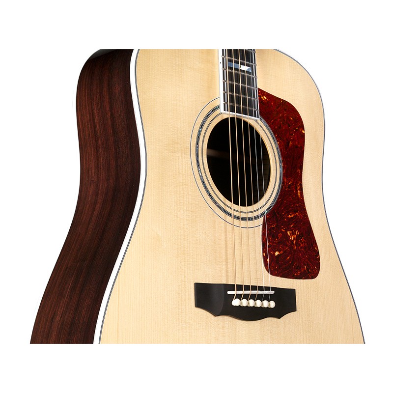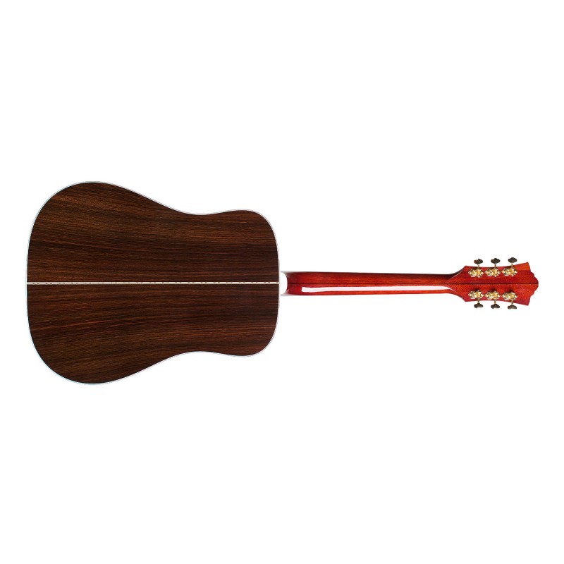 Introdotta per la prima volta nel 1968 come special order top-of-the-line, la D-55 fu talmente apprezzata da indurre la Guild ad introdurla nella regolare produzione già dal 1974. Notoriamente utilizzata da Tommy Smothers nei suoi show nei 1960s, D-55 rimase longeva e popolare, divenendo la preferita di artisti come Waylon Jennings, Billie Joe Armstrong, e David Nail. Reintrodotta nel 2017 Guild D-55 è tornata migliorata e attuale . La D-55 resta fedele nelle dotazioni alla sua antenata del 1968, includendo un top in abete rosso Sitka, fondo e fasce in palissandro indiano massello, tastiera e ponte in ebano, finitura in nitrocellulosa lucida natural. Le finiture interne prevedono un incatenatura in Adirondack oltre ad un attacco del manico a coda di rondine riveduto e corretto per rendere questa generazione di D-55 la più leggera e suonabile di sempre. La D-55 prevede la più riconoscibile paletta Guild e presenta la Guild “Peak e Shield” in combinazione di inlay su ebano figurato. La tastiera in ebano è fornita di inlay iconico “V-Blocks” e multi-line “railroad track”., la scala è 651 mm, il nut (capotasto) ha una larghezza di 43 mm in osso come per il traversino, i binding e il purfling sono in ABS, il battipenna in cellulloide tartarugata. La tastiera della D-55 è inserita su un manico in mogano profilo C con un bellissimo rinforzo in walnut centrale che corre lungo tutta la lunghezza fino alla paletta. Le meccaniche in dotazione sono Gotoh SE700 dorate La finitura a nitro della D-55 è disponibile in Natural è data a spruzzo, con uno spessore minimo per garantire la massima risonanza. delle essenze. Ogni chitarra include un certificato di autenticità firmato e una custodia rigida in legno Guild con un sistema di umidificazione Humicase® ..