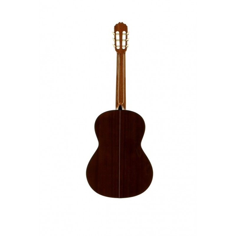 Chitarra classica. Top solido in cedro. Fasce e fondo in mogano. Manico in mogano. Tastiera in palissandro indiano. Capotasto in osso. Meccaniche placcate in nickel. Binding in pali