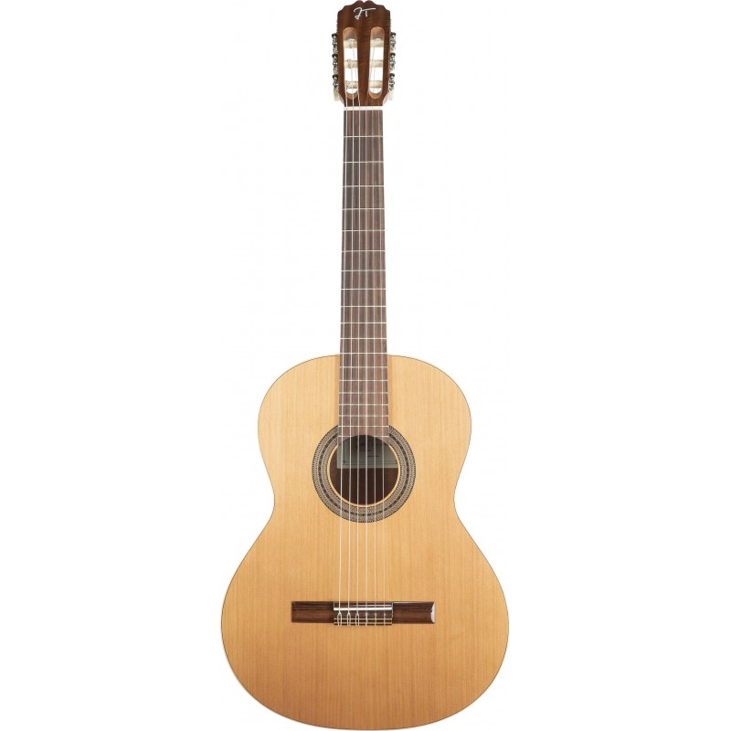 Chitarra classica. Top solido in cedro. Fasce e fondo in mogano. Manico in mogano. Tastiera in palissandro indiano. Capotasto in osso. Meccaniche placcate in nickel. Binding in acer