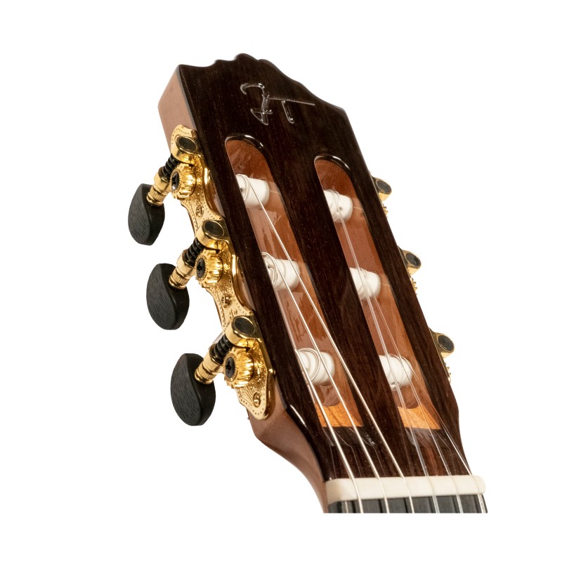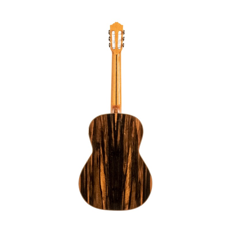 Chitarra classica. Top solido in cedro. Fasce e fondo in ebano esotico massello. Manico in cedro. Tastiera in ebano. Capotasto in osso 52mm. Ponte in palissandro. Meccaniche dorata. Binding in palissandro indiano....