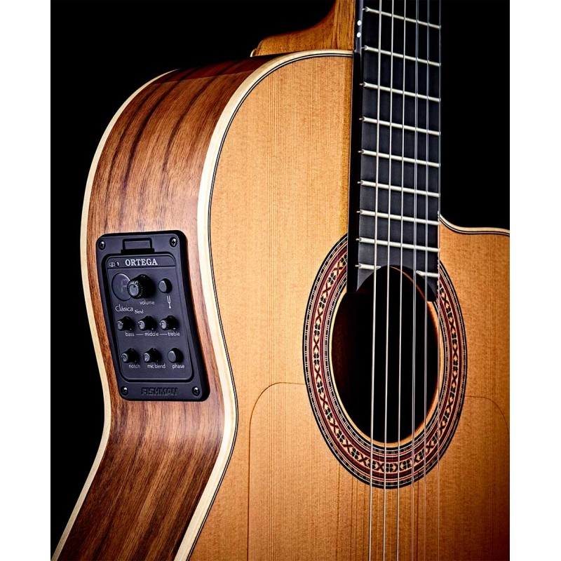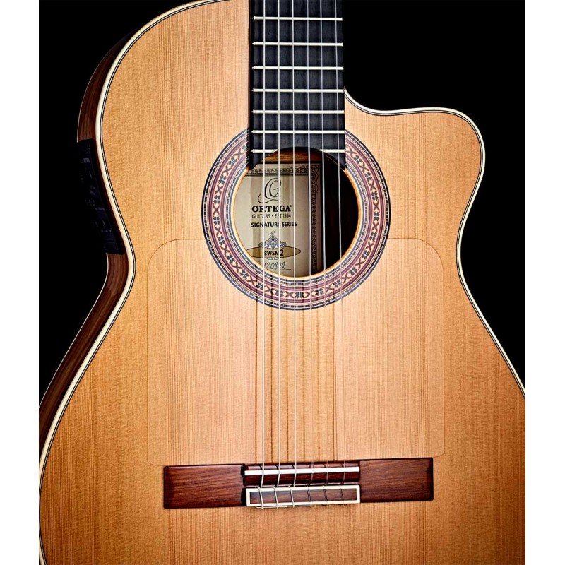 Chitarra elettro classica BWSM/2 Ben Woods signature. Fatto a mano in Spagna con corpo in massello di noce e tavolo in cedro rosso massiccio. Electronica Fishman / Ortega Classic Blend. Ortega bridge con 12 fori per...