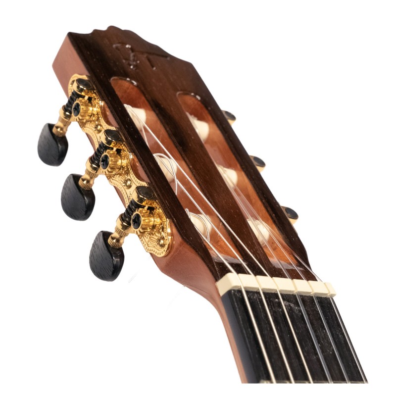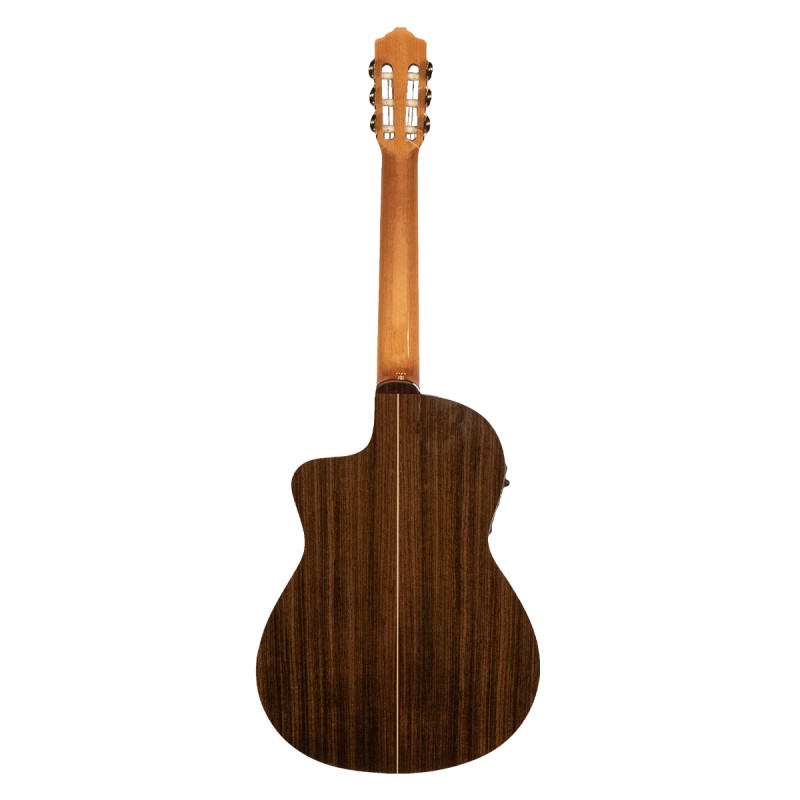 Chitarra classica cutaway elettrificata. Top solido in cedro. Fasce e fondo in palissandro indiano. Manico in cedro. Tastiera in ebano. Capotasto in delrin 52mm. Meccaniche dorata. Binding in sapelly. Preamplificatore...