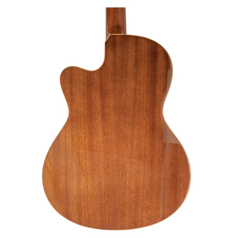 Chitarra classica elettrificata con cutaway tipo crossover. Top solido in cedro. Fasce e fondo in mogano. Manico stretto in mogano. Tastiera in palissandro indiano. Capotasto in osso 48mm. Meccaniche placcate in...