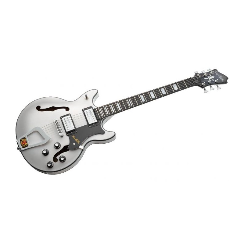 Alvar - Swedish Frost, corpo semi-hollow in Ply-Maple sagomato, Set-Neck in acero, T-O-M a escursione lunga, Hagstrom Trapeeze, 2 x HJ50 Alnico 5, 2 x Vol RC-Circuit, 2 x Tone, 3-Way Pick-up Toggle Switch, Lunghezza...