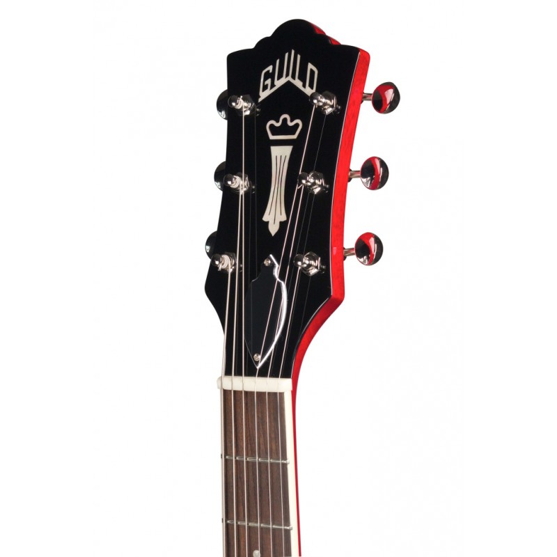 'Guild’s Starfire III è equipaggiata con dotazioni extra da grande chitarra nata per il rock ‘n’ roll, per chi cerca una combinazione tra look appariscente e straordinarie possibilità sonore. Hollow-body extra-Thin, single cutaway Florentine. Il grande ritorno di una chitarra rock tra le più amate nei primi anni '60, con una grandissima personalità, la chitarra ha un corpo in mogano con tavola e fondo arcuati ( Arched) , il manico in mogano con profilo ''Soft U'', la tastiera in palissandro con Dot in madreperla, la scala della chitarra è di 629 mm, il nut di 43 mm. Il ponte è un tune -o-matic con base in palissandro abbinato ad un ponte vibrato progettato da Guild in alluminio Bigsby Style. I pickup sono gli LB-1 Little Bucker in ALNiCo 5 replica degli originali mini humbucking Guild. Questi pickup, hanno un suono che sta giusto a metà tra un humbucker e un mini-bucker . La finitura è poliuretanica lucida Cherry Red. Con custodia rigida TKL.'
