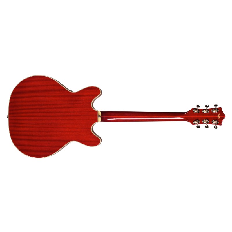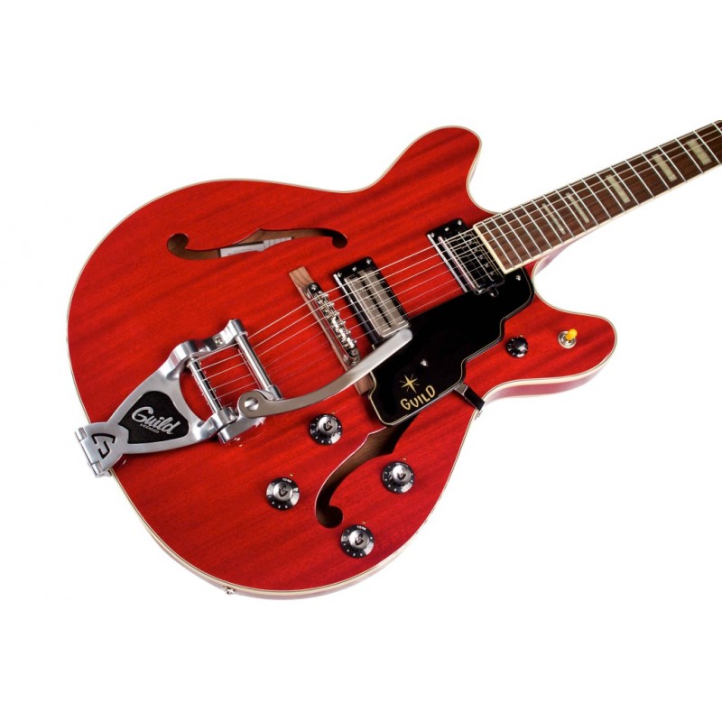 'Una splendida double cutaway la classica Guild Starfire V è una bellezza semi-hollow con un corpo extra thin da 16 3/8'' e una coppia di pickup Guild LB-1 ''Little Bucker'' che la rendono una scelta perfetta per rock, blues, roots e molto altro. Il corpo tutto in mogano della Starfire V presenta top e fondo arcuati, con una coppia di buche a f , elegante binding in avorio bianco e costruzione a blocco centrale per migliorarne stabilità e sustain. Altre dotazioni includono manico in tre pezzi mogano/acero/mogano con l'acero come rinforzo centrale, il profilo del manico è vintage con il suo morbido profilo a ''U'', tastiera in palissandro a 22 tasti con raggio 9 1/2'' e inlay a block madreperlati, switch a tre vie per i pickup, controllo tono e volume individuale per ogni pickup e master volume.Il ponte è un tune-,o -Matic con base in palissandro , leva vibrato Guild Bigsby Style, meccaniche Grover Sta-Tite con ratio 18:1 , hardware nickelato e una splendida finitura Cherry Red poliuretanica lucida . In dotazione la custodia rigida TKL.'