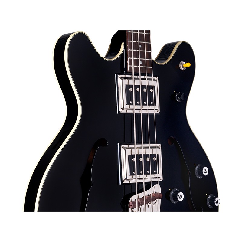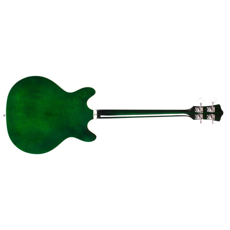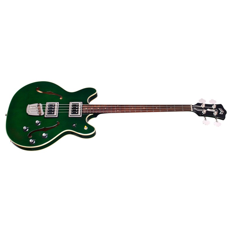 'Starfire Bass II è un basso da due pickup semi-hollow che aggiunge importanti possibilità sonore ad uno dei più iconici modelli Guild: il basso Starfire. L'originale Starfire Bass II debuttò nel 1967, subito dopo la versione a singolo pickup, e rapidamente trovò apprezzamento da parte di musicisti come Jack Casady (Jefferson Airplane) e Phil Lesh (Grateful Dead). L' aggiunta del pickup Bisonic BS-1 al manico dona allo strumento un suono caldo e morbido, per grande versatilità. Questo basso a doppio cutaway presenta top e fondo in laminato di mogano arcuato (Arched) , il manico è in mogano in tre pezzi con rinforzo in acero centrale con profilo ''Soft U'', il nut è di 38 mm e la scala dello strumento è di 781 mm, la tastiera è in palissandro con dot in madreperla. In dotazione troviamo i pickup dual Guild BS-1, con manopole individuali per volume, tono, e master volume e uno switch per la selezione, il ponte regolabile della Guild con sellette in palissandro o Ebano mentre le meccaniche sono grover 142 Vintage. Una chiara finitura high gloss poliuretanica lucida Emerald Green contribuisce alla bellezza di questo basso. Starfire Bass II offre il classico suono Guild vintage vibe ai bassisti moderni. Inclkude la custodia rigida TKL.'