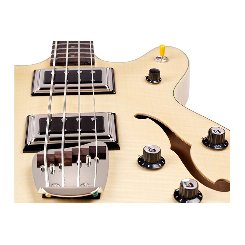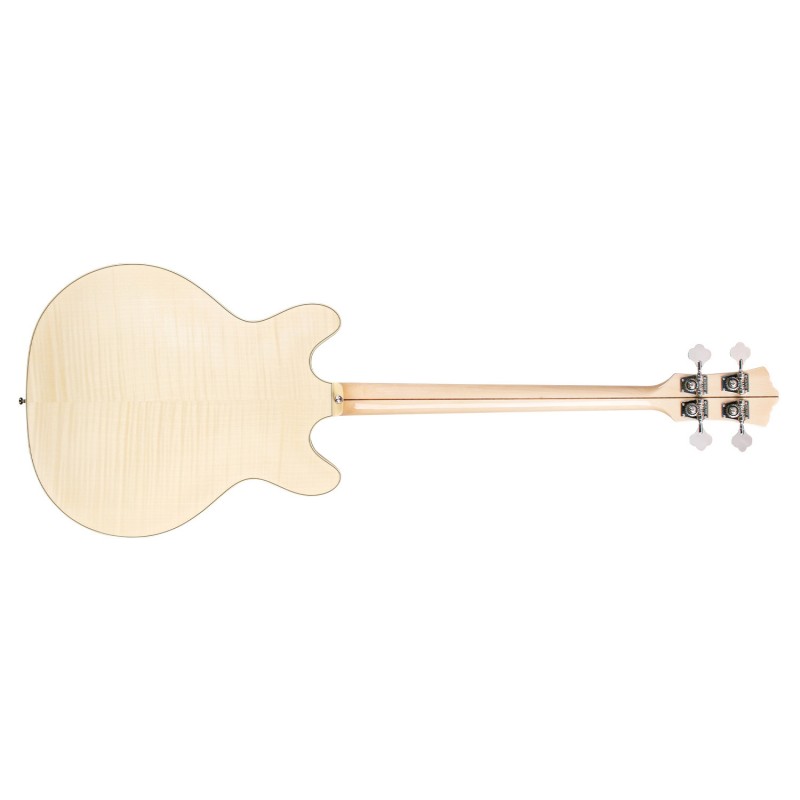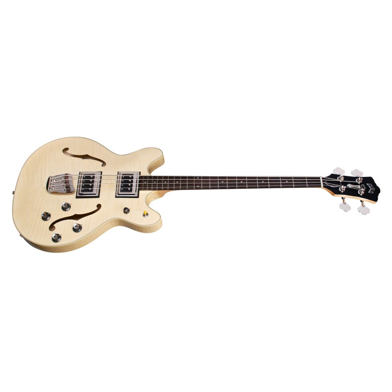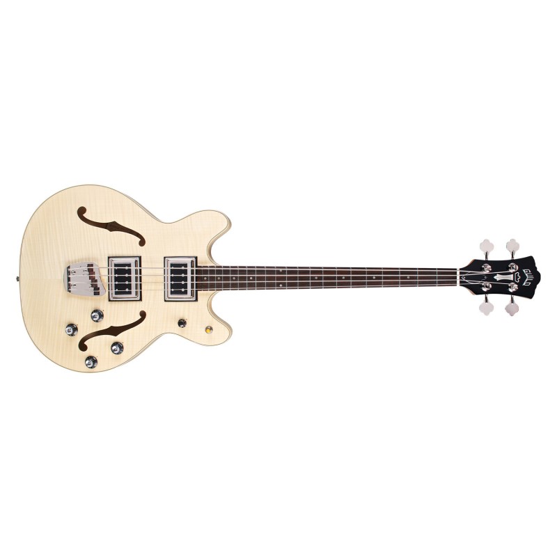'Starfire Bass II è un basso da due pickup semi-hollow che aggiunge importanti possibilità sonore ad uno dei più iconici modelli Guild: il basso Starfire. L'originale Starfire Bass II debuttò nel 1967, subito dopo la versione a singolo pickup, e rapidamente trovò apprezzamento da parte di musicisti come Jack Casady (Jefferson Airplane) e Phil Lesh (Grateful Dead). L' aggiunta del pickup Bisonic BS-1 al manico dona allo strumento un suono caldo e morbido, per grande versatilità. Questo basso a doppio cutaway presenta top e fondo in laminato di acero fiammato arcuato (Arched) , il manico è in acero in tre pezzi con rinforzo in noce ( Walnut) centrale con profilo ''Soft U'', il nut è di 38 mm e la scala dello strumento è di 781 mm, la tastiera è in palissandro con dot in madreperla. In dotazione troviamo i pickup dual Guild BS-1, con manopole individuali per volume, tono, e master volume e uno switch per la selezione, il ponte regolabile della Guild con sellette in palissandro o Ebano mentre le meccaniche sono grover 142 Vintage. Una chiara finitura high gloss poliuretanica lucida Natural contribuisce alla bellezza di questo basso. Starfire Bass II offre il classico suono Guild vintage vibe ai bassisti moderni. Inclkude la custodia rigida TKL.'