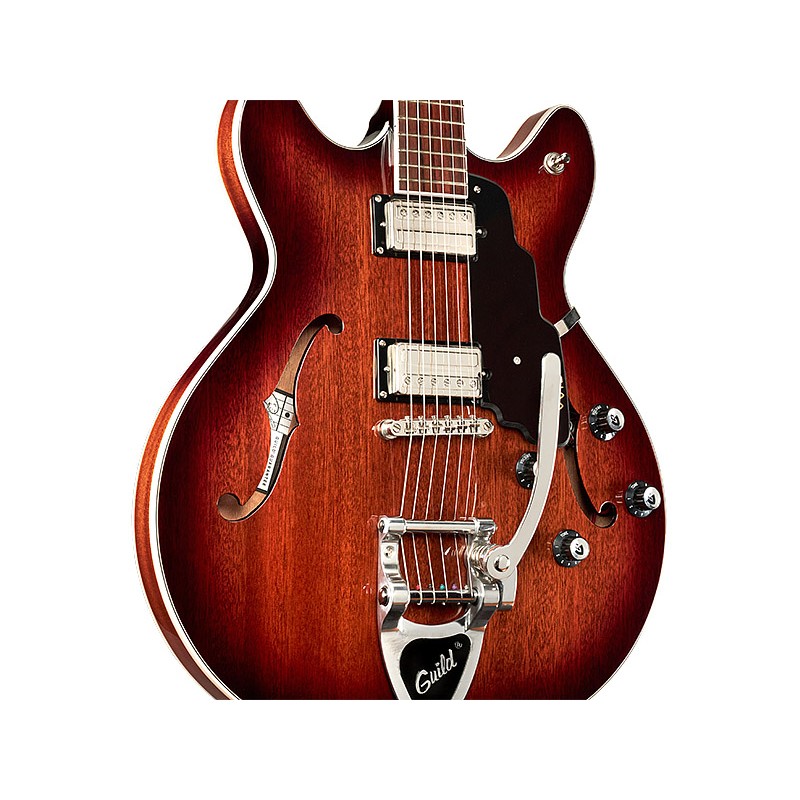 La Starfire I è dotata di humbucker Guild HB-2 Alnico al manico e al ponte, con coil splitting push-pull per consentire toni melodici e single coil da entrambi i pickup. La finitura California Burst completa il corpo in mogano con la classica linea di manico e paletta, secondo il classico stile Guild degli anni '60.