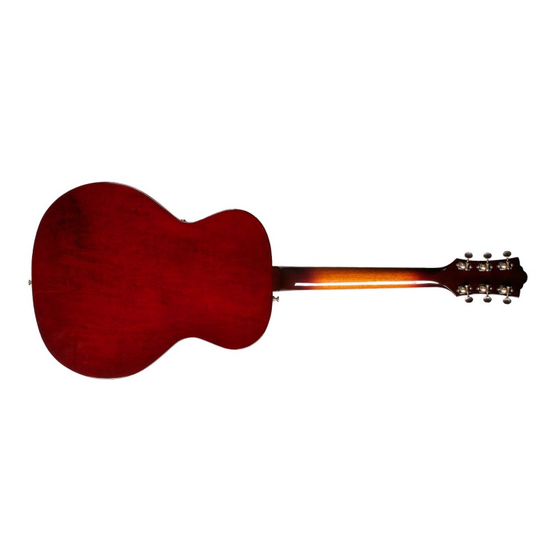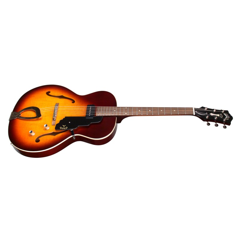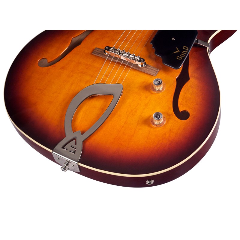 Modello non-cutaway con corpo sottile e top in acero arcuato. La Guild T-50 Slmin VSB deriva da un modello T-50 degli anni '60 , la costruzione della chitarra prevede fondo e fasce in acero, il manico ( profilo soft U) in due pezzi di mogano con tastiera in Ebano e dot in madreperla, il nut e di 43 mm e la scala dello strumento e di 629 mm. Bellissimi i dettagli vintage come per la cordiera Guild dorata e il ponte tune o matic con base in Ebano, l'iconica paletta e il binding avorio con anche il battipenna monostrato danno a questo strumento un fascino incredibile che ci riporta alle classiche Guild dei '50 e '60. Il Pickup single coil low output P90 Franz ( con orecchie). Questi pickup furono istallati su molti modelli Guild negli anni 70 e furono prodotti dalla compagnia Franz di New York, la costruzione è in ALNiCo 5 su una bobina a base larga, produce un suono cristallino , generoso ricco di sustain dalla timbrica Vintage adatto ad ogni stile.completano le caratteristiche di questa chitarra, che offre alle nuove generazioni di musicisti il classico suono Guild.La finitura è poliuretanica lucida Vintage Sunburst.