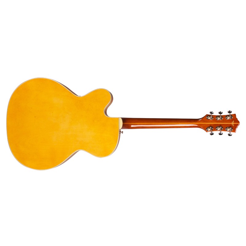 'Una delle chitarre Hollow-body meglio riuscite, uno straordinario strumento per i solisti che vogliono spaziare dallo swing al Jazz fino al Rock'n Roll. La Guild’s X-175B Manhattan è un capolavoro tra le chitarre Arch-Top in commercio. Presenta le stesse eccezionali caratteristiche della sorella X-175 Manhattan, costruzione Hollow-Body con tavola in abete massello e fasce in acero con fondo in acero arcuato ( Arched) , il solido manico in tre parti in mogano con rinforzo centrale in acero ha il ''Profilo Soft U'' il nut da 43 mm, la tastiera è in palissandro o Ebano con Inlay block in madreperla, il binding e il purfling in ABS nero e avorio. La scala dello strumento è di 629 mm, il ponte è un tune o matic con base in palissandro o ebano con leva vibrato Bigsby style progettato dalla Guild. Le meccaniche sono Grover Vintage style aperte con ratio 18:1, i pickup sono P90 Franz con orecchie. Questi pickup furono istallati su molti modelli Guild negli anni 70 e furono prodotti dalla compagnia Franz di New York. La costruzione è in ALNiCo 5 su una bobina a base larga, produce un suono cristallino , generoso ricco di sustain dalla timbrica Vintage adatto ad ogni stile.completano le caratteristiche di questa chitarra. La finitura e poliuretanica lucida natural. La dotazione è completata da una bella custodia TKL rigida.'