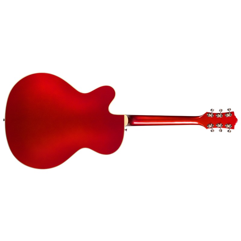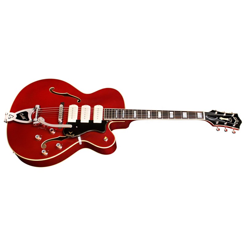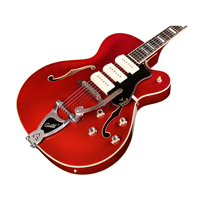 'Presentata negli anni '50 come uno dei modelli top del catalogo Guild la X-350 Stratford ritorna ora più elegante che mai! Full hollow-body con un elegante top arcuato in abete massello con incatenature in abete rosso, le fasce sono in acero con il fondo in acero arcuato (Arched) che conferiscono alla Stratford l'iconico suono generoso e ricco di armoniche rendendola un riferimento per gli artisti dell'epoca. I tre pickup Franz P90 single coil permettono una grande versatilità, dai suoni più ruggenti alle suggestive atmosfere morbide jazzy o Rockabilly. I controlli intuitivi permettono di utilizzare i tre storici pickup P90 Franz con facilità in ogni configurazione. Complemento alle possibilità sonore di questa chitarra il ponte tune o matic con la leva vibrato Guild Bigsby style per un playing espressivo.Le meccaniche Grover in Stile Vintage sono aperte con ratio 18:1. Altre dotazioni includono buche ad f, l' iconica paletta Guild in madreperla come gli inlay block della tastiera in Ebano, il manico ( Con profilo ''''Soft U'''') in tre pezzi di mogano con rinforzo centrale in acero, il nut da 43mm e la scala dello strumento è di 629 mm. La custodia rigida è della TKL completa la dotazione, la finitura è poliuretanica lucida è Scarlet Fade'