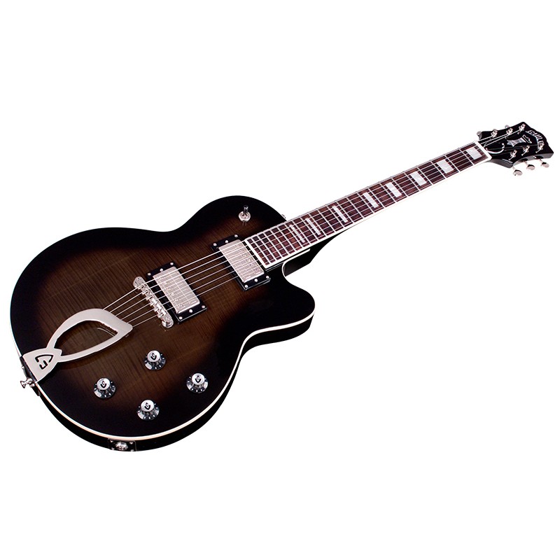 'La Aristocrat HH Con il suo corpo in mogano con top arcuato ( curved) ''single cut solid body'' con camere tonali è uno strumento leggero e confortevole , la Aristocrat HH offre stabilità e suono delle tipiche solid body ma con un peso decisamente inferiore grazie alle camere tonali che rendono il suono corposo e ricco di armoniche. Il manico è in mogano in tre pezzi con profilo C , la tastiera è in Pau Ferro con inlay block madreperlati, il binding è in ABS avorio. La scala dello strumento è di 629 mm, il nut in osso (capotasto) e di 43 mm. Le meccaniche sono Guild Vintage style con ratio 18:1, il ponte dorato è un tune o matic con cordiera corta dorata. Il comparto elettronico comprende i pickup HB-1, la HB-2 in Alnico II che la rendono perfetta per rock, R&B e ogni genere musicale.La finitura è poliuretanica lucida Trans Black Burst.'