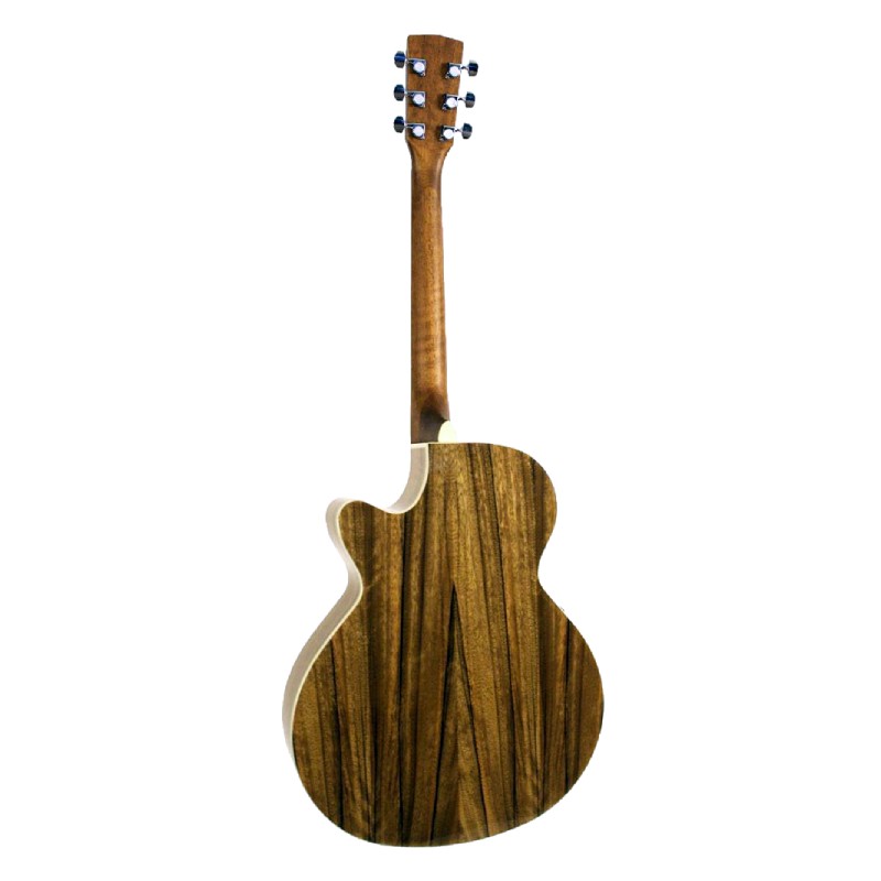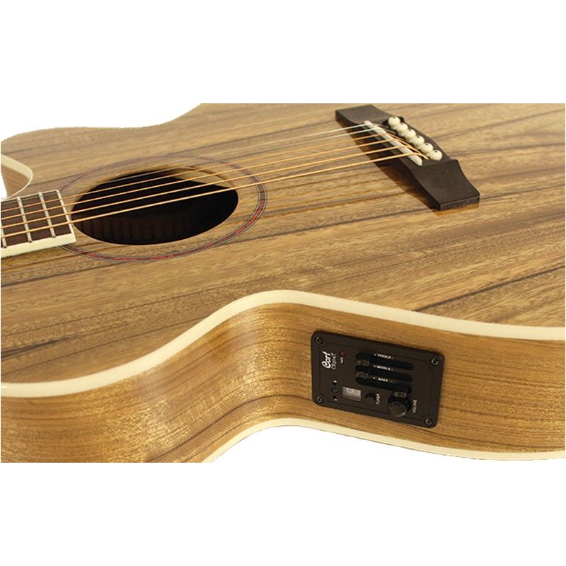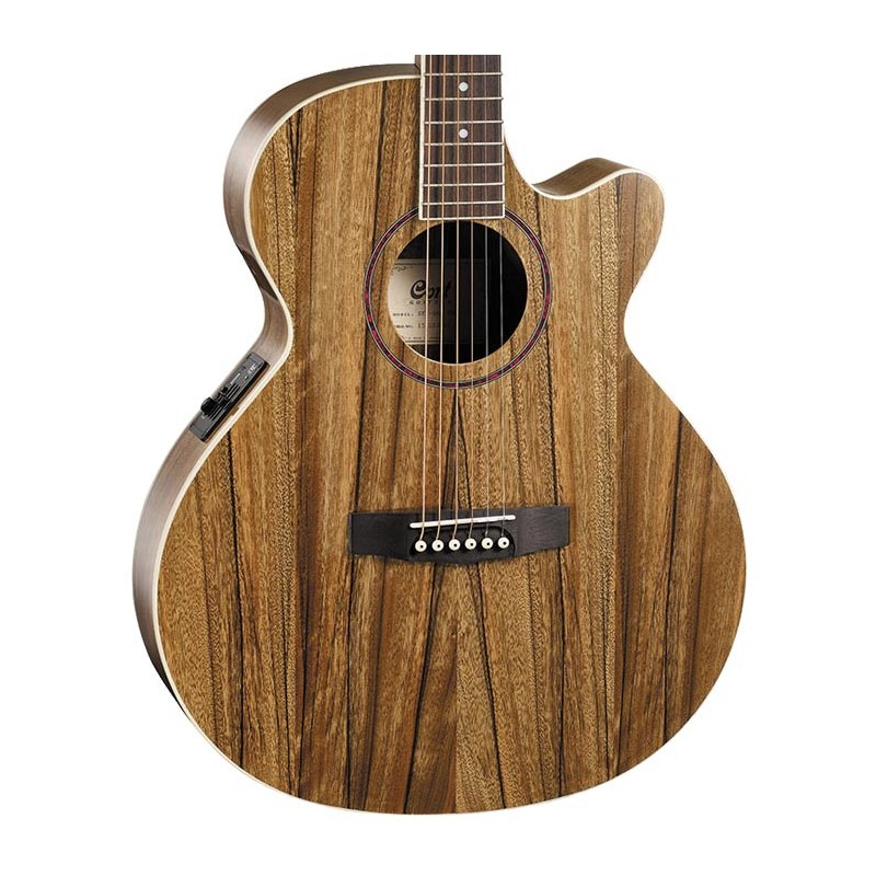 Chitarra acustica elettrificata con fasce strette da 83 mm. Tavola, fasce e fondo in Dao. Manico in mogano. Tastiera e ponte in palissandro. 20 tasti. Scala 25,3. Pickup in ceramica. Preamplificatore Cort CE304T....