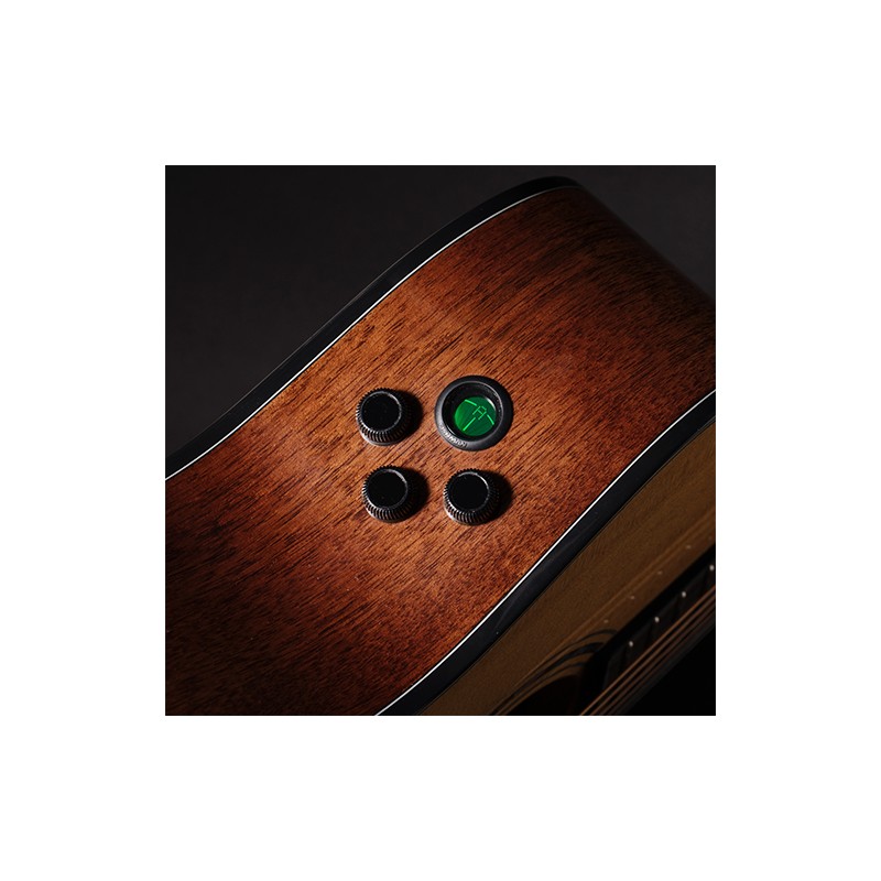 Chitarra elettroacustica con cutaway tipo OM. Tavola in abete Sitka tostato massiccio, fasce e fondo in mogano massiccio. Manico in mogano con tastiera in ebano Macassar. Accessori dorati. Meccaniche Grover....