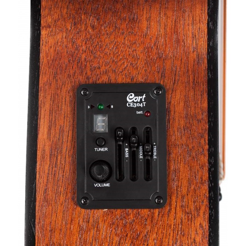 Chitarra elettroacustica da concerto. Tavola in abete. Fasce, fondo e manico in mogano. Tastiera e ponte in palissandro. 20 tasti. Preamplificatore Cort CE304T. Finitura Open pore.