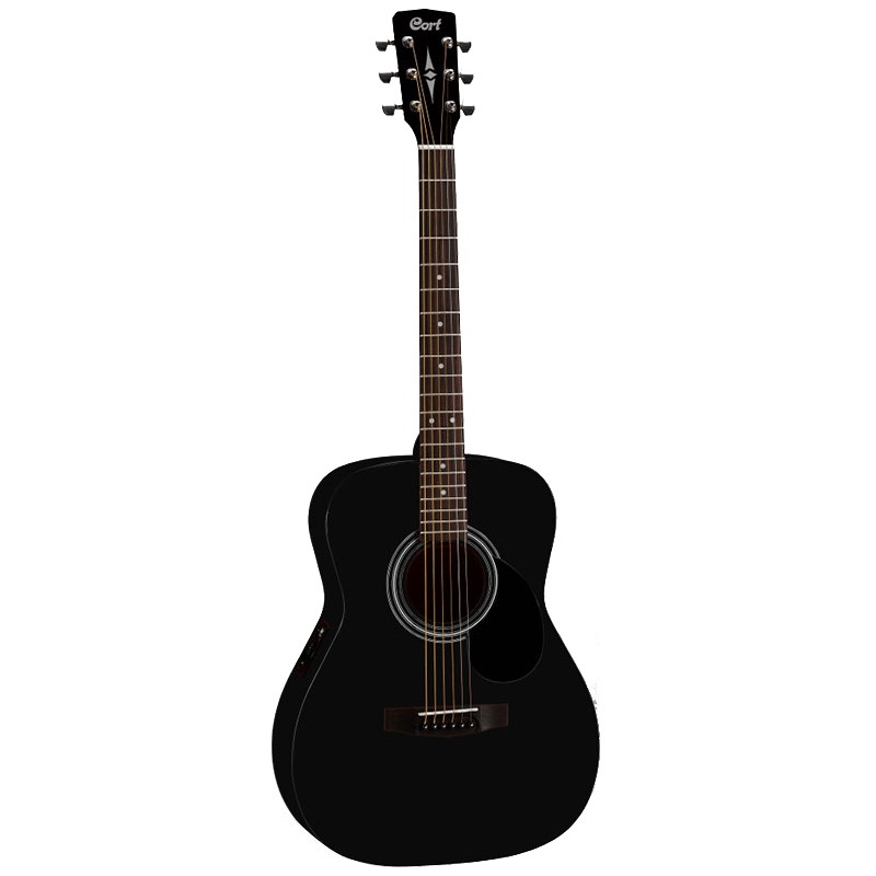 Chitarra acustica elettrificata di tipo Folk. Manico in mogano con tastiera in merbau. Corpo con fasce e fondo in mogano, tavola laminata in abete. Preamplificatore Cort CE304T. Finitura nera opaca.