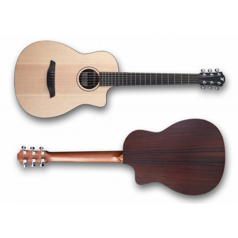 Furch Pioneer-ER, chitarra acustica, corpo da viaggio, cutaway, tavola in Piano in abete Engelmann, fondo e fasce in palissandro indiano , Booster Soundport sul lato anteriore, fondo e fasce in mogano massello, manico in mogano, tastiera e ponte in ebano, larghezza del capotasto 45 mm, scala 615 mm, finitura naturale a pori aperti, inclusa borsa da concerto, Made in Europe (Tschechien), made in europe (czech republic)