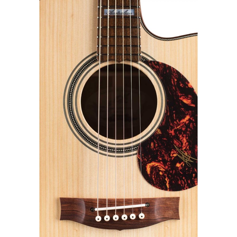 'Modello EA80C, forma del corpo: dreadnought con spalla smussata, tavola: pino Bunya australiano, fondo e fasce: Blackwood AA con bordo in Blackwood e acero duro, manico: legno nero, tastiera e ponticello: acacia del deserto, rinforzo: Maton Scalloped X, intarsi sulla tavola/rosetta: abete, bordo interno: piroli, Bordo esterno: legno nero con bordo in acero, lunghezza della scala: 64,77 cm 25,5'', piastra della testa: legno nero con strisce in acero e foro per la chiave, tasti: Dunlop 6260, numero di tasti: 21, Raggio della tavola: 304,8 mm 12'', Larghezza al capotasto: 44,1 mm 1,736'' / 1 47/64'', Larghezza al 14 tasto: 55 mm 2,165'' / 2 11/64'', Intarsi della tastiera: Punti in madreperla da 6 mm, intarsi in madreperla australiana al 17 tasto, Finitura del fondo e delle fasce: Satinata naturale, Finitura della tavola: Naturale lucida UV, Barre di rinforzo e meccaniche: ABS avorio, Meccaniche: Grover Rotomatic dorate, Fascia di protezione: Carey con M dorato, Perni/cinghia: dorati, Silletto e ponticello: osso, Custodia: custodia rigida Hiscox, Microfono: AP5 PRO, Corde: Elixir Nanoweb 80/20 Bronze 1253'