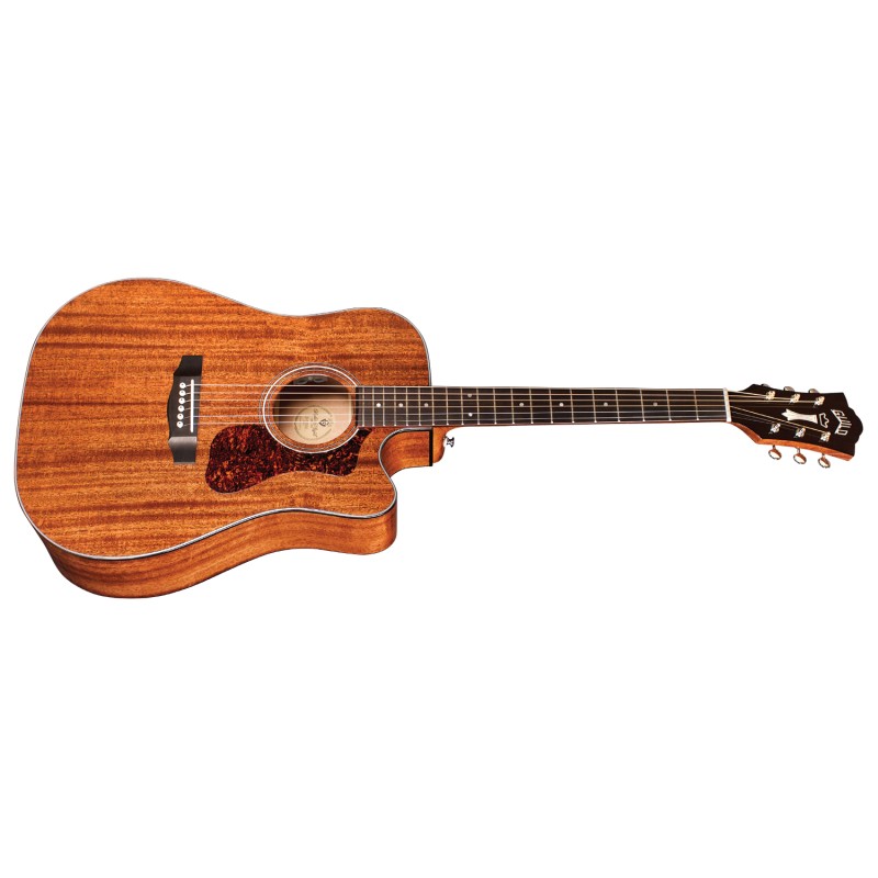 'La potenza sonora di questa Guild dreadnought spalla mancante offre al chitarrista uno strumento che ricorda le vecchie Dreadnought di un tempo con un piu' facile accesso alle note alte. La chitarra è costruita con top, fondo e fasce in mogano africano massello con incatenatura in Abete Sitka, la tastiera e il ponte in palissandro, il manico è in mogano con Profilo C. La D-120 presenta nut (capotasto) e traversino in osso, la rosetta è in madreperla . La chitarra ha una larghezza del nut di 1 3/4'' (44,5mm) come le vecchie Dreadnought , l'iconica paletta Chesterfield con logo madreperlato, emblema delle Guild dei '60 regala a questo strumento un fascino unico ha il logo in madreperla, il battipenna in stile d'epoca in celluloide tartarugata, le meccaniche aperte stile Vintage completano la dotazione. La nuova custodia Guild leggera in polyfoam è in dotazione . La finitura è Natural Gloss ( Lucida) poliuretanica.Sistema di amplificazione Fishman GT-1.'