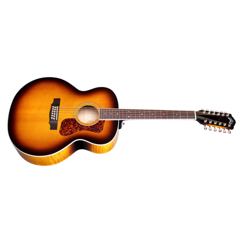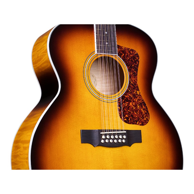 'La F-2512E Deluxe Maple ATB combina due delle più iconiche specialità di Guild: La 12 corde e la chitarra jumbo. Con il loro corpo largo e arrotondato le chitarre acustiche jumbo sono state il pezzo forte di Guild fin dal 1954, combinando questa forma con la popolare costruzione 12-corde ha permesso di realizzare uno strumento nato per lo strumming adatto ad accompagnare la voce di artisti famosi. Costruita con top in abete Sitka rosso massello, fasce e fondo ( Arcuato) in acero la F-2512E Deluxe ATB Maple ha il tono chiaro e jangly caratteristico delle chitarre Guild a 12 corde . Il caratteristico design del fondo arcuato offre grande volume e proiezione sonora, lungo sustain e un suono ricco e definito. La F-2512E Deluxe ATB Maple presenta un elettronica GT-1 Fishman ottimo per performance live, la tastiera e il ponte sono in Pau Ferro, il manico è in in mogano Profilo C con finitura satinata poliuretanica, il nut (48 mm) e traversino sono in osso, la rosetta in madreperla, il battipenna in stile d'epoca in celluloide tartarugata. La finitura è poliuretanica Antique Sunburst.'