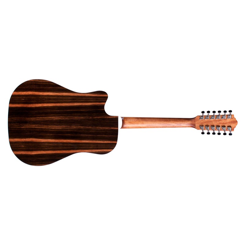 La D-2612CE Deluxe ATB è una chitarra Dreadnought 12-corde dal suono potente e corposo, il top è in abete Sitka rosso massello con uno splendido fondo arcuato in Ebano striato, come le fasce. Questo legno dona alla D-2612CE Deluxe una voce potente e ricco di armoniche con un ottimo sustain. La finitura poliuretanica gloss (Lucida) evidenzia le venature del legno esotico utilizzato, questo strumento è un aggiunta straordinaria alla grande tradizione Guild nelle 12 corde. Le altre dotazioni comprendono la rosetta in madreperla, il logo Guild alla paletta in madreperla , la tastiera e il ponte sono Pau Ferro, il manico in mogano Profilo C con larghezza al nut di 48 mm.Il pickup Fishman Sonitone GT-1 con controllo volume e tono completa la dotazione garantisce buone performance live, la finitura è poliuretanica lucida ATB ( Antique Sunburst ) per il top e Natural per fasce e fondo.